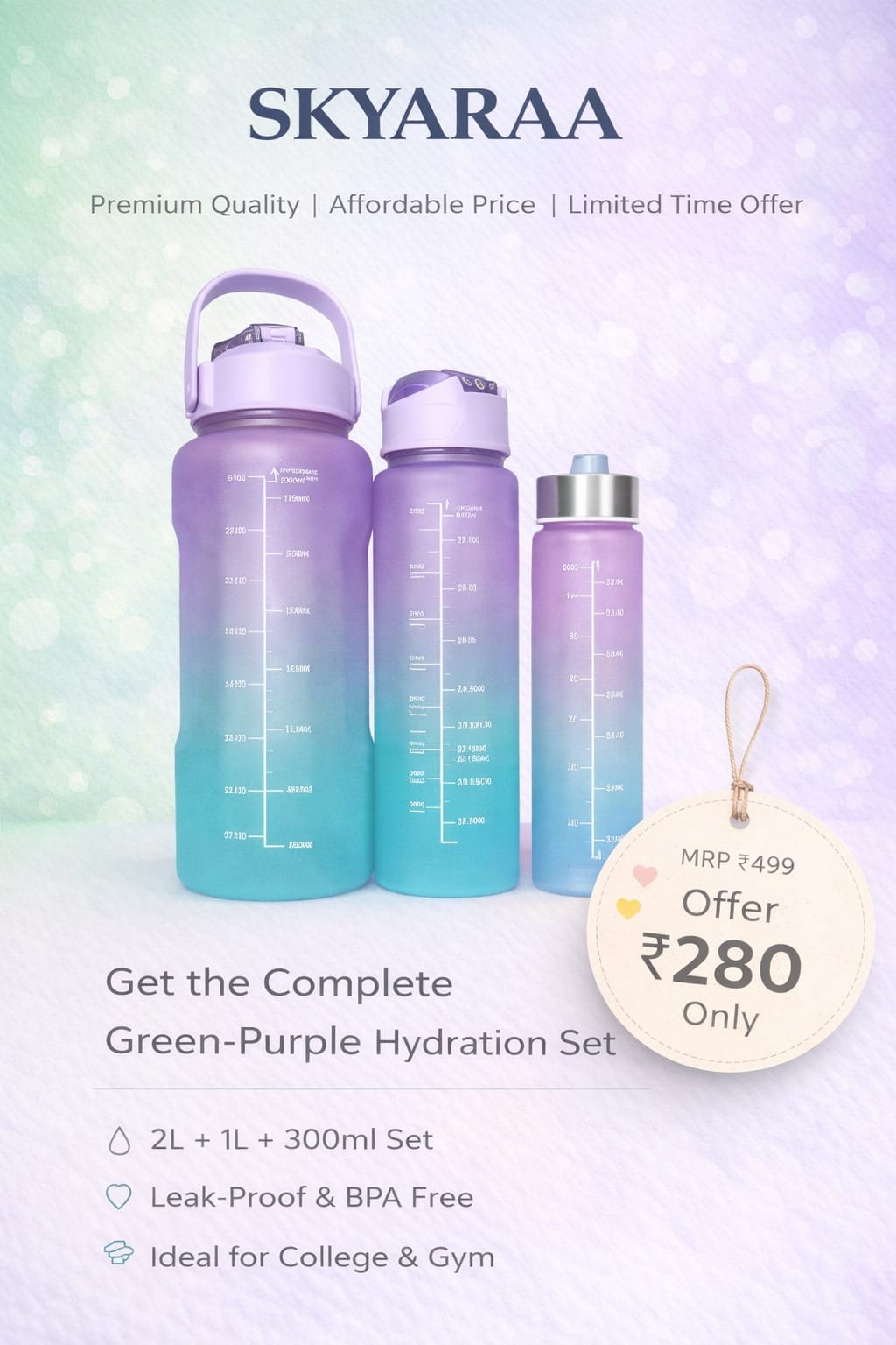 Stay refreshed, organized, and motivated throughout the day with the SKYARAA Green-Purple Hydration Set. Designed for style and functionality, this premium 3-bottle combo helps you track your daily water intake effortlessly — whether you’re at college, the gym, office, or traveling.